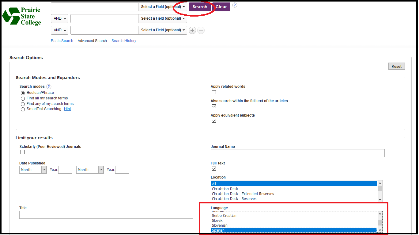 2. Select Spanish as the Language. Click "Search." This will retrieve all library materials that are available in Spanish.